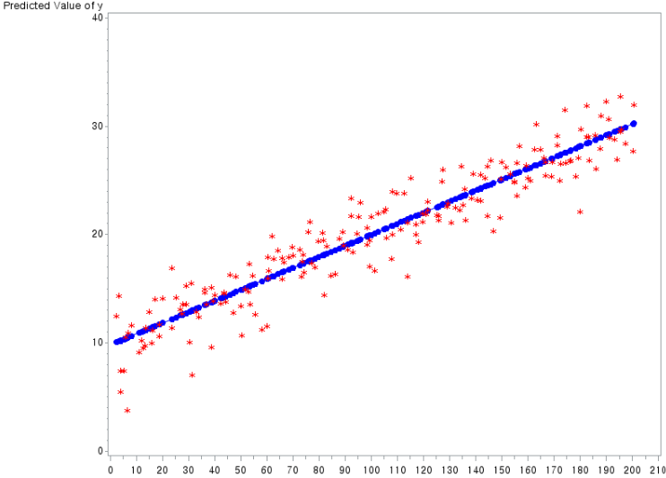 PLOT pred*x y*x /OVERLAY; /* pred*x y*x 그림을 겹쳐 그림 (OVERLAY Option */