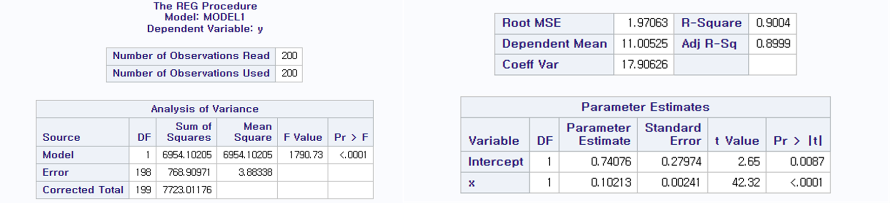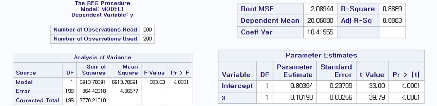 마찬가지로 200개의 sample로 회귀 분석을 한 결과이다. 주요 통계량을 살펴보면 아래와 같다.