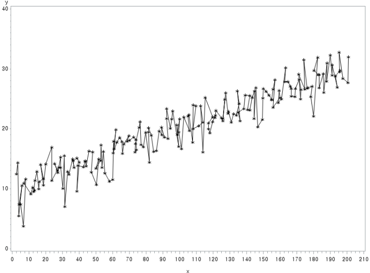GPLOT을 통해 y와 x의 관계가 그림으로 도식화되어 나타나고 있다.