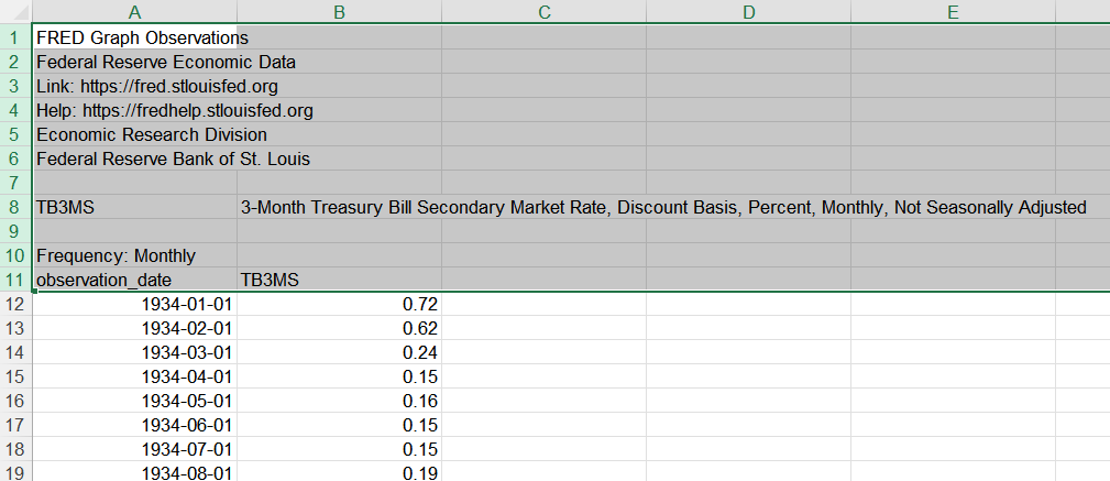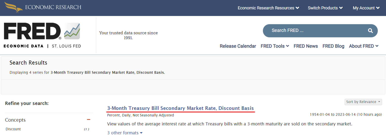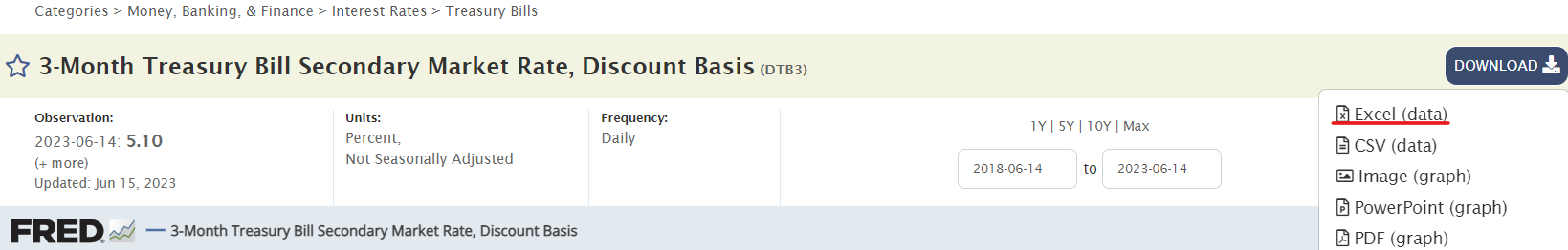 우리가 실습을 위하여 다운로드 받아야 할 파일은 "3-Month Treasury Bill Secondary Market Rate, Discount Basis"다.