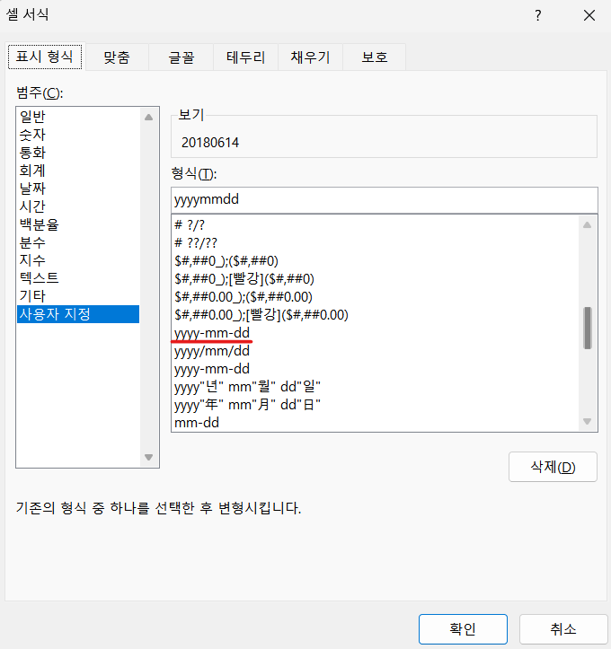 "표시 형식"을 누르면 위와 같이 셀 서식을 지정할 수 있다. 사용자 지정 > yyyy-mm-dd 선택 > "yyyy-mm-dd"에서 hyphen(-) 2개를 삭제하는 과정을 거치면 이제 이 파일을 사용할 준비가 된 것이다.