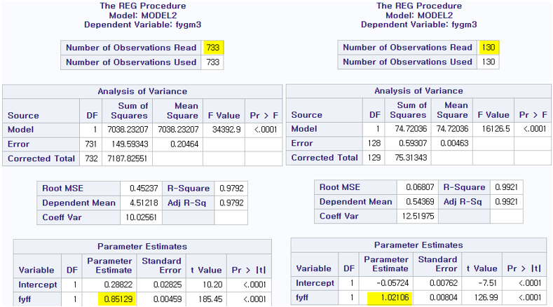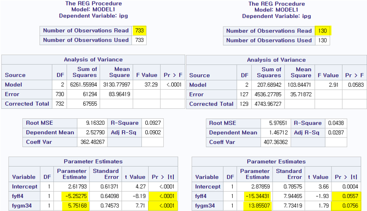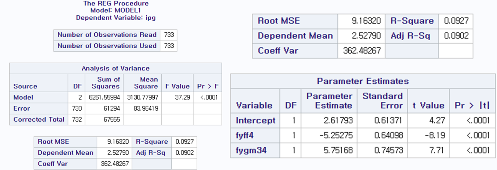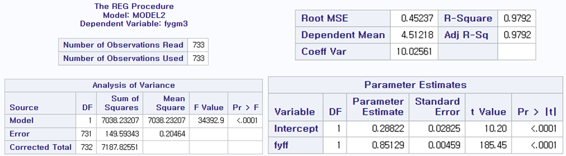 표는 해당 프로그램의 샘플에서 특정 시기의 관측값(fygm3, fyff)을 나타낸 것이다. 해당 표에서 확인할 수 있듯이 글로벌 금융 위기 이후, 즉 2009년 4월 이후 2016년 2월까지는 fyff와 fygm3 0.5% 미만을 유지했다. 이로 인해 독립 변수(설명 변수) fyff와 fygm3 금리가 매우 작은 값으로 전환되어 parameter의 추정치의 절댓값은 커짐을 알 수 있다.