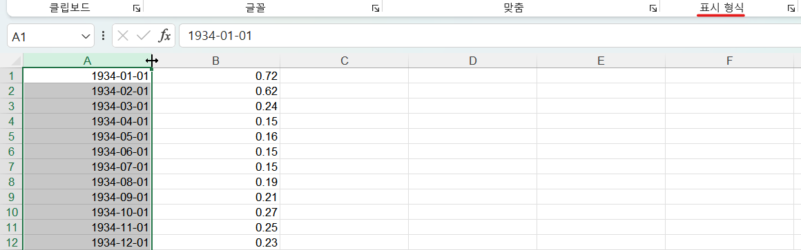 날짜가 적힌 열을 shade 한다. A에 커서를 대고 클릭하면 A열이 모두 shade 된다. 그 이후에서는 "표시 형식" 메뉴에서 오른쪽 작은 아래 화살표 부분을 클릭하자.