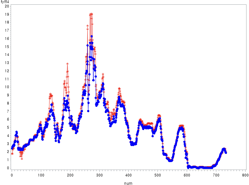 num 변수는 mon 변수의 일련번호라고도 할 수 있다. 즉, 해당 GPLOT Procedure 결과는 시기에 따른 fyff4, fygm34 값을 나타낸 산점도라고 할 수 있다. 직전 프로그램과 마찬가지로 실제 산점도로부터 fyff4와 fygm34는 유사한 분포를 가짐을 확인할 수 있다. 즉, fyff와 fygm3는 거의 같은 데이터라고 볼 수 있다.