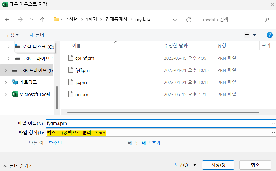F12를 누르면 파일을 다른 이름으로 저장할 수 있다. 파일 형식(T)을 "텍스트(공백으로 분리)"로 선택하고, 파일 이름(N) fygm3를 입력하여 "저장"을 하자. (/mydata/ 디렉터리는 이미 생성되어 있어야 함.)