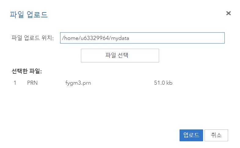 파일 선택을 누르면 내 컴퓨터 디렉터리가 화면으로 뜨게 된다. 업로드할 데이터가 저장된 디렉터리(\mydata\)로 가서 fygm3.prn 파일을 클릭하여 업로드를 하면 실제 DATA를 분석할 준비가 끝났다.