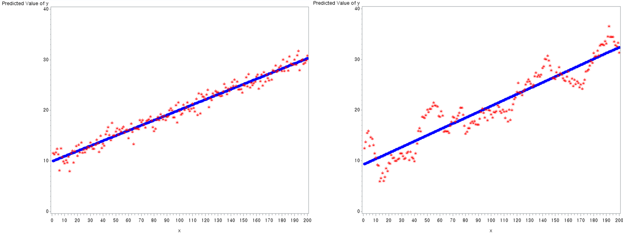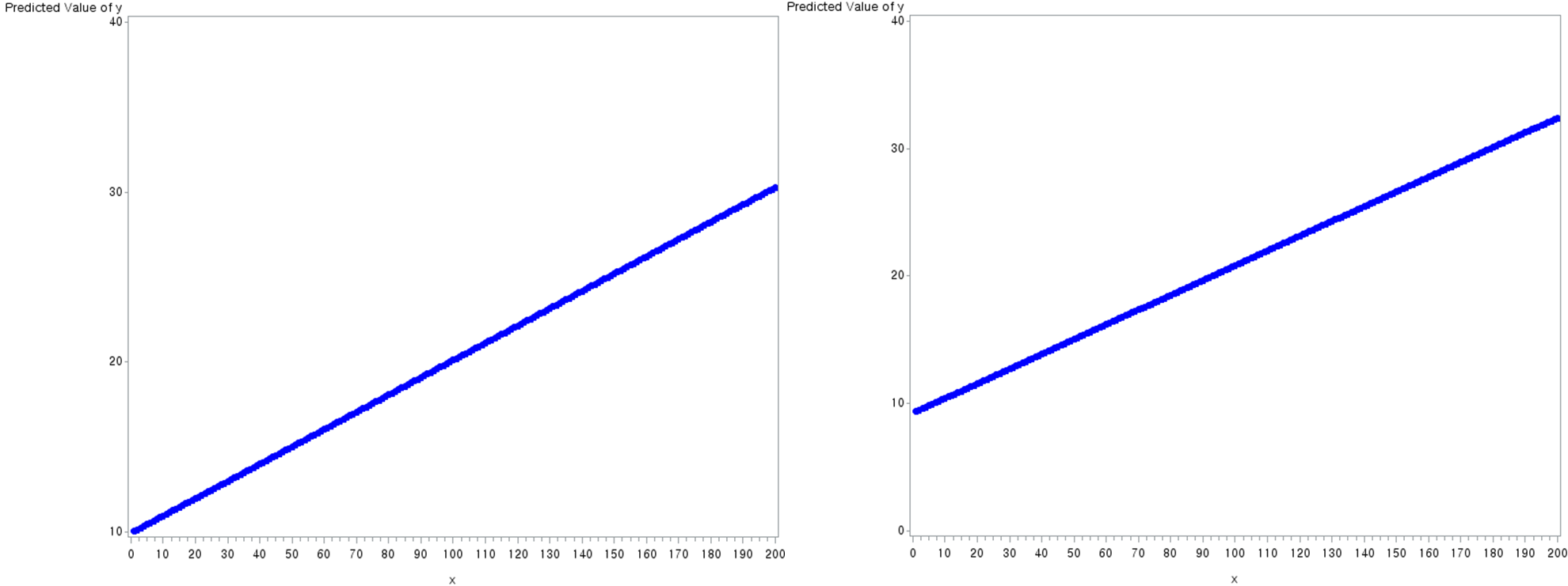 GPLOT을 통하여 pred*x 관계를 도식화한 그림과 y*x 관계를 도식화한 그림은 위와 같이 나타난다.