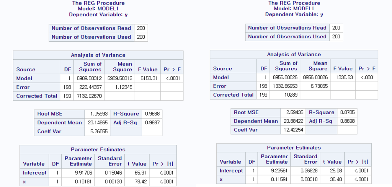 위의 두 프로그램은 각각 Classical Assumption을 모두 만족시키는 모형과 Classical Assumption 중 3번째를 만족시키지 못하는 모형을 분석한 프로그램이다. 각 프로그램의 실행 결과를 비교하여 나타내면 아래와 같다.