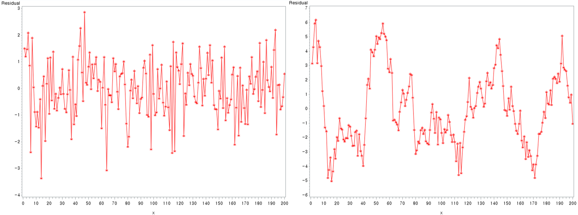 PLOT resid*x; /* 세로축을 resid, 가로축을 x로 지정 */
