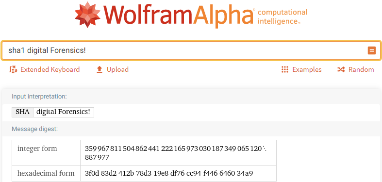 : 이 예시에서는 SHA1을 이용한다. 해시 값 확인은 www.wolframalpha.com/ 에서 확인할 수 있다. 확인하는 방법은 사용하고 싶은 해시 함수(MD5, SHA1 등)를 입력하고 스페이스를 입력한 다음 문자열을 입력하면 된다.