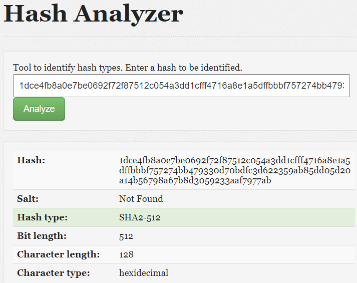 Page 1을 클릭했을 때의 모습이다. URL Parameter에 GET 방식으로 page=1이 전달되면서 해시 값처럼 보이는 문구가 출력되는 것을 볼 수 있다. 이를 Hash Analyzer에 넣고 분석해봤다.