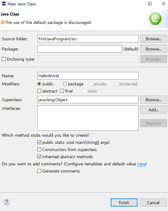 위의 두 가지 사항을 생각하며 입력 창에 위의 사진과 같이 입력을 하고 선택을 한다. 아직 패키지에 대해 제대로 배운 상태가 아니므로 위의 default 패키지를 사용하는 것은 권장되지 않는다는 문구는 일단 무시해 주도록 한다. 이제 Finish를 선택하면 많은 것이 생성된다.