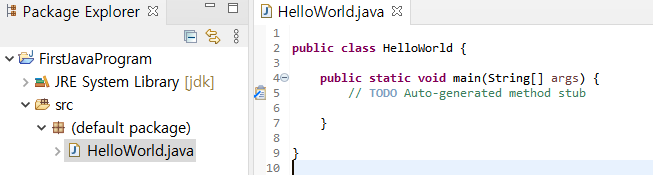 클래스 이름을 입력했을 뿐인데 소스파일 역시 생성해 주는 것을 볼 수 있다. 프로젝트 디렉터리 안의 src 디렉터리를 살펴보면 소스파일을 볼 수 있다. 이제 main method 안에 문장을 직접 넣어 코드를 입력해 주자.