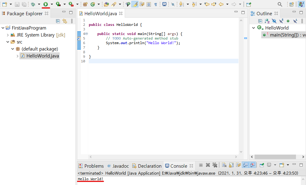 System.out.println("Hello Wolrd!"); 문장을 직접 입력한 뒤, ▶ 기호를 누르면 실행 결과를 확인할 수 있다.