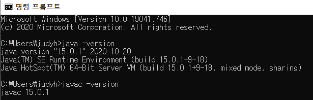 cmd 창에 java -version, javac -version 명령어를 입력해 Java SE의 설치를 확인하자.