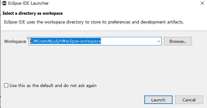 Installer에서 첫 번째 ~for Java Developers를 눌러 설치를 진행해 주면 된다. 설치 경로를 지정하고, 라이선스에 동의하면 설치가 정상적으로 진행된다. 설치 후 실행을 하면 아래와 같이 workspace를 지정할 수 있다.