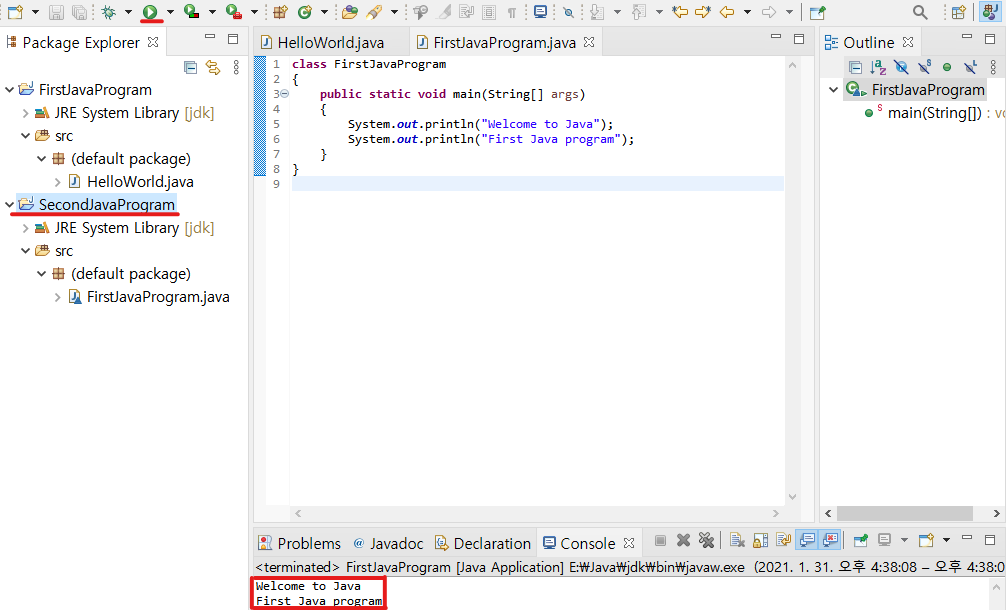 Eclipse를 설치하고 간단한 Java 프로그램을 실행해 봤다.