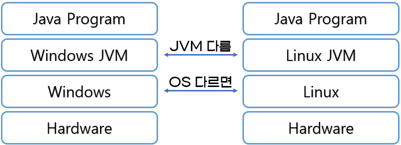 위와 같이 운영체제 별로 존재하는 차이점을 가상머신이 중간에서 해결한다. 하지만 운영체제 별로 자바 프로그램을 실행시키는 가상머신이 다르므로 운영체제에 따른 적절한 가상머신의 설치는 신경 써야 한다.