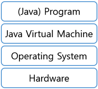 하드웨어를 기반으로 동작하는 운영체제가 자바 가상머신을 실행시키고, 자바 가상머신이 자바 프로그램을 실행시키는 구조로 동작한다. 자바 가상머신은 운영체제 위에서 동작하는 일종의 소프트웨어이다.