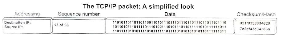 모든 패킷은 동일하게 헤더, 페이로드, 푸터 세 부분으로 구성되어 있다. 헤더에는 송수신자의 IP 주소가 담겨 있고 주소 정보를 저장한다. 다음으로 얼마나 많은 패킷이 있는지 그 중에서 해당 패킷은 몇 번째 패킷인지 알려준다. 그다음으로 페이로드가 온다. 마지막으로 수신자에게 해당 패킷이 마지막 패킷임을 알려주는 푸터로 패킷이 완료된다. 또한 CRC(Cyclical Redundancy Check, 순환 중복 검사)도 한다. CRC는 패킷에 있는 모든 1의 합이다. 만약에 숫자가 일치하지 않는다면 데이터를 수신하는 컴퓨터에서 자동으로 데이터를 다시 요청해 재전송한다. CRC는 패킷의 무결성을 검증하는 데 사용된다. 아래 사진은 TCP/IP 패킷의 구성을 나타낸 그림이다.