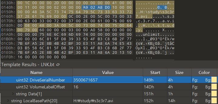 LINKINFO 부분에서는 원본 파일의 경로와 파일이 위치한 VolumeID의 시리얼 번호를 알 수 있다. 먼저 경로는 LocalBasePath에 나와있듯이 H:\study\s3c3r7.avi임을 알 수 있다. 볼륨 시리얼 넘버의 경우 운영체제에서 저장장치를 포맷할 때 생성되는 고유한 16진수 값이다. (en.wikipedia.org/wiki/Volume_serial_number 참고)