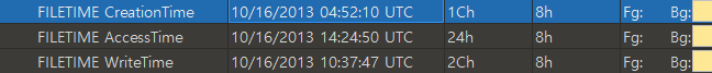 HEADER 부분에서 파일의 생성, 접근, 쓰인 시간을 알 수 있었다. 하지만 이 시간은 UTC 기준이고, 문제에서 제시하는 시간의 기준은 GMT+9이므로 이에 맞춰 9시간을 더해서 키 값을 구해야 한다. 따라서 파일의 생성 시각은 2013/10/16/ 13:52:10라고 할 수 있고, 파일의 마지막 실행된 시각은 2013/10/16 23:24:50라고 할 수 있다. 또한, 파일이 쓰인 시각은 2013/10/16 19:37:47이라고 할 수 있다.