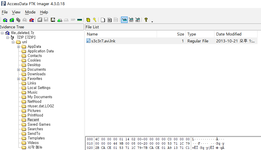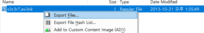 누가 봐도 수상해 보이는 "s3c3r7.avi.lnk" 파일이 있다. 하지만 최종 수정 시간이 아닌, 우리가 알아야 할 것은 원본 경로와 만들어진 시간, 마지막으로 실행된 시간, 볼륨 시리얼을 모두 알아야 한다. 여기서 lnk 파일은 링크 파일이다. 바탕화면이나 시작 메뉴에 프로그램을 놓으면 원본 위치를 가리킨다. 윈도우에서 작동하는 확장자다.