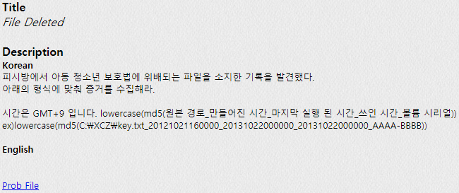 xcz.kr의 36번째 문제는 File Deleted다. 포렌식 문제이고, 찾아야 할 내용은 아래와 같다.