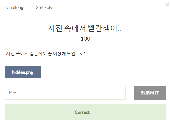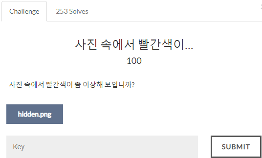 hidden.png 파일이 있고, 빨간색이 조금 이상해 보인다는 힌트가 설명으로 쓰여 있다. 파일 이름에서 무언가 숨겨져 있는 것 같다는 생각이 들었고, 스테가노그래피 문제라고 판단했다. 사진은 아래와 같다.
