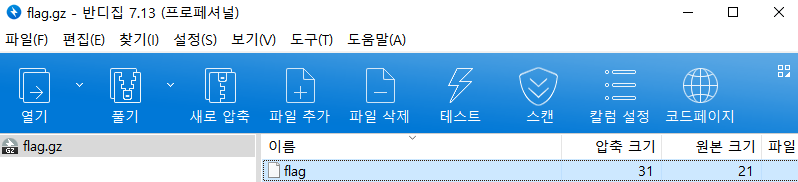 확장자가 GZ임을 확인할 수 있었다. 따라서 이 파일을 flag.gz로 수정한 후 이 파일을 열었다.