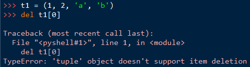 튜플의 요소를 리스트처럼 del 함수로 지우려고 하면, 튜플은 요소를 지우는 행위가 지원되지 않는다는 형 오류(TypeError) 메시지를 확인할 수 있다.