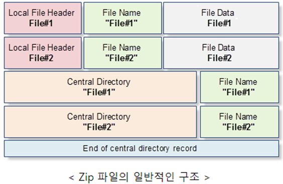 위와 같이 zip 파일의 일반적인 구조는 크게 3개의 파일 구조(Local File Header, Central Directory, End of central directory record)로 되어 있다. 이때, 파일 하나 당 하나의 Local File Header, Central Directory는 반드시 가져야 한다. 이 문제에서 제공된 압축 파일 내부의 파일은 2개다. 따라서 2개의 Local File Header, 2개의 Central Directory, 1개의 End of central directory record를 가져야 정상적인 파일 구조라고 할 수 있다.